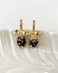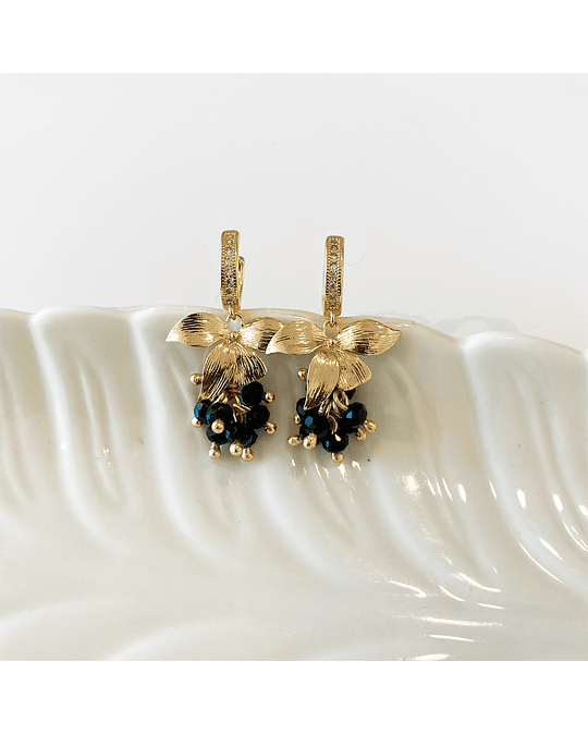 Aro bañado en oro con base con incrustaciones de circones, colgante de flor y racimo de cristales negros.