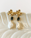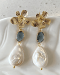 Aro dorado con base de flor bañada en oro, cristal azul grisáceo y perla barroca.