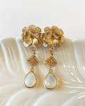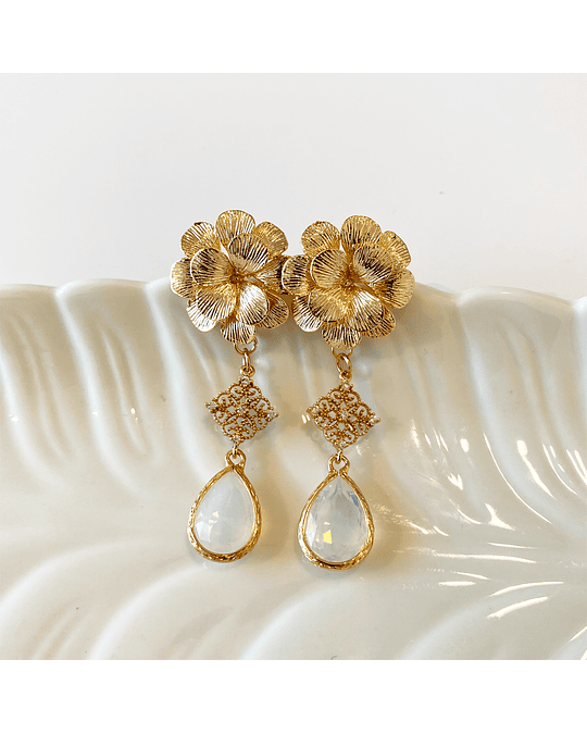 Aro dorado con base de flor bañada en oro, conector en forma de rombo con incrustación de circonitas y colgante de cristal blanco.