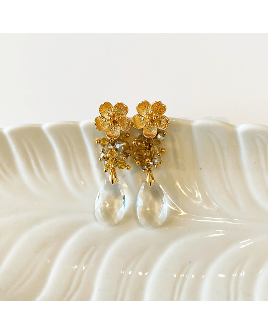 Aro dorado con base de flor bañada en oro, racimo de cristales en tonos amarillos y colgante de cristal transparente.