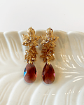 Aro dorado de base en forma de hoja bañada en oro 18k, racimo de cristales en tonos beige y dorados y cristal color bordó.