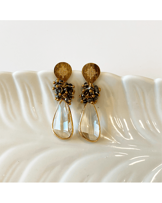 Aro con base bañada en oro 18k, con racimo de cristales en tonos gris azulado y cristal transparente.