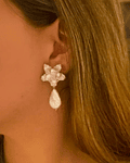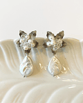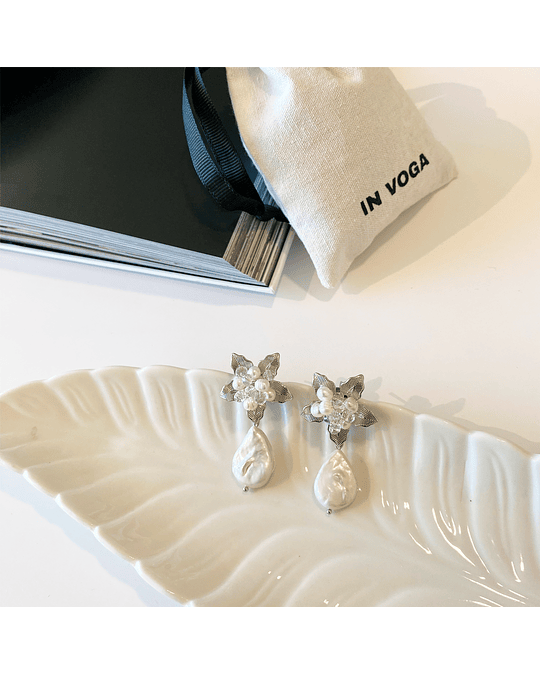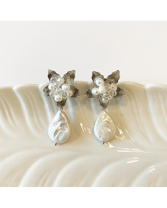 Aro plateado con base de flor bordada con cristales y perlas de río y un colgante de perla barroca. (La perlas de río y perlas barrocas son irregulares)
