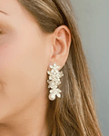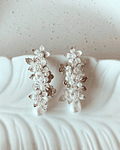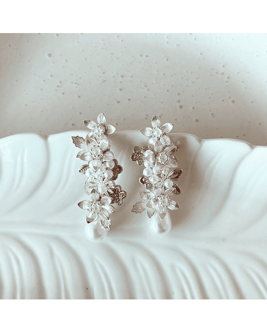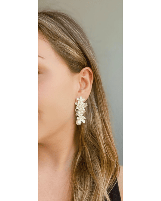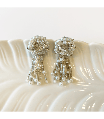 Aro plateado bordado a mano con piezas metálicas plateadas y perlitas de fantasía. (Aritos irregulares y no idénticos entre sí)
