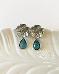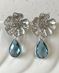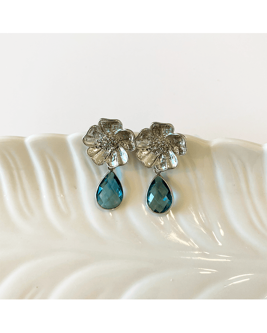 Aro plateado con base de flor bañada en plata y cristal azul facetado bañado en plata.